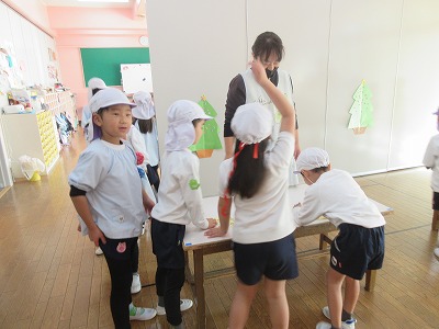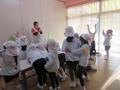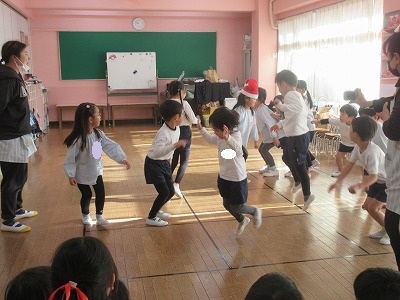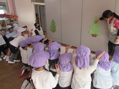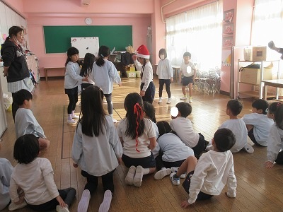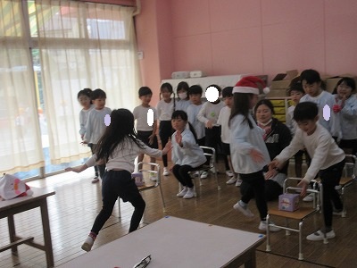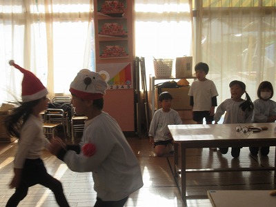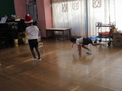クラス毎にクリスマスお楽しみ会をしました。藤組さんでは、新しいゲームをしました。サイコロをふって変身グッズを身につけて、サンタさんはスキップ・トナカイさんは手足走りといった具合に変身してリレー形式のゲーム。9つのマスの中をみんなで移動するけどサンタさんと同じマスになった人がアウトになるゲーム。ジャンケンゲームは先生に勝つまでジャンケンして勝ったらツリーにシールが貼れるゲーム。大盛り上がりで、マスゲームは園庭でも楽しんだね💕