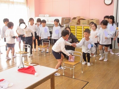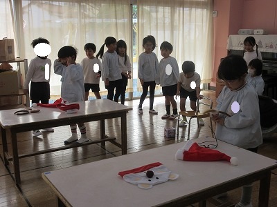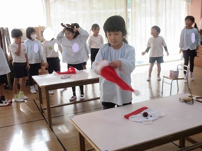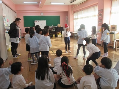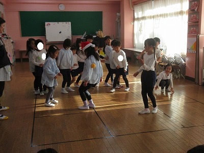 クラス毎にクリスマスお楽しみ会をしました。藤組さんでは、新しいゲームをしました。サイコロをふって変身グッズを身につけて、サンタさんはスキップ・トナカイさんは手足走りといった具合に変身してリレー形式のゲーム。9つのマスの中をみんなで移動するけどサンタさんと同じマスになった人がアウトになるゲーム。ジャンケンゲームは先生に勝つまでジャンケンして勝ったらツリーにシールが貼れるゲーム。大盛り上がりで、マスゲームは園庭でも楽しんだね💕