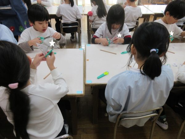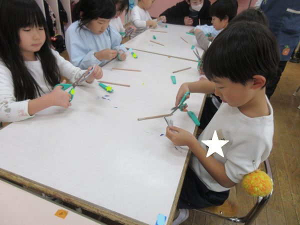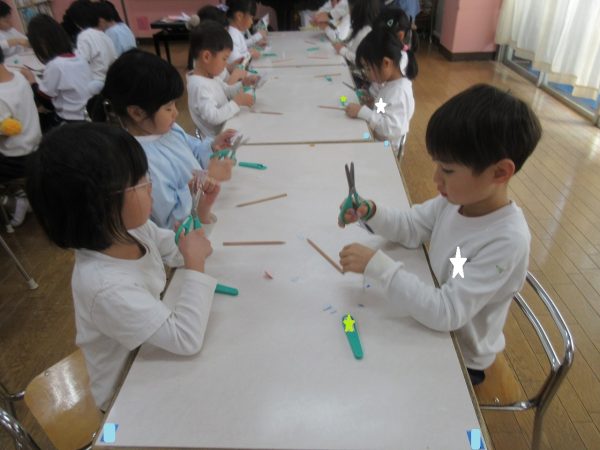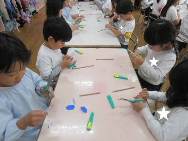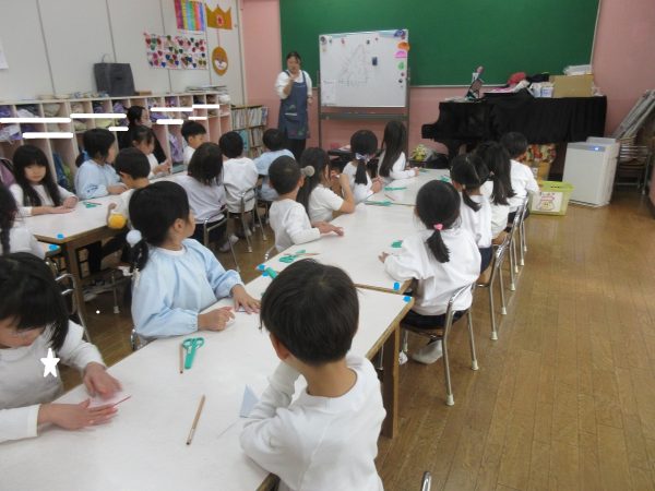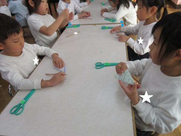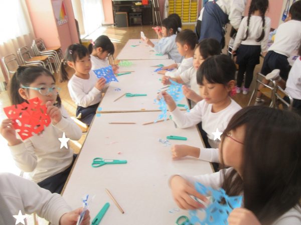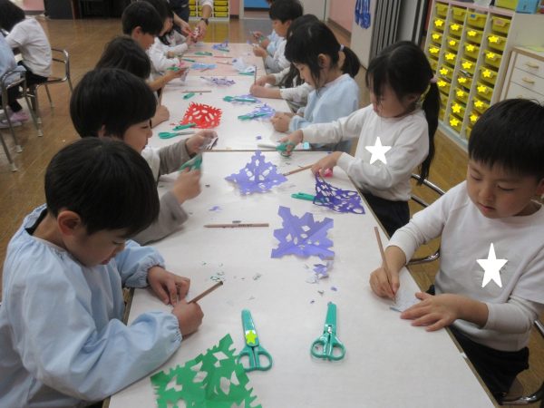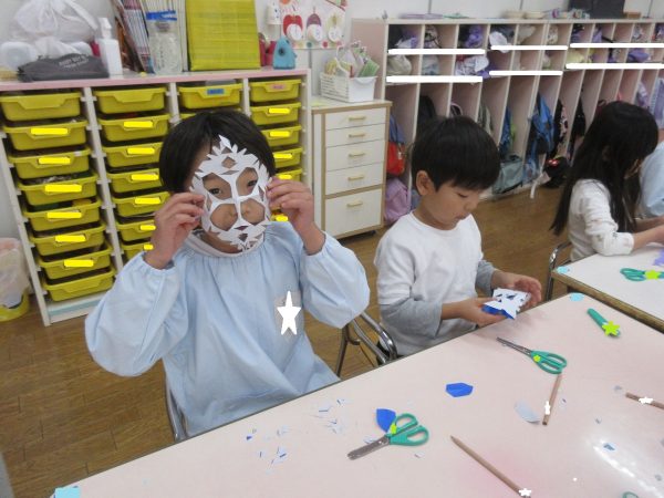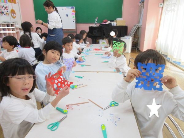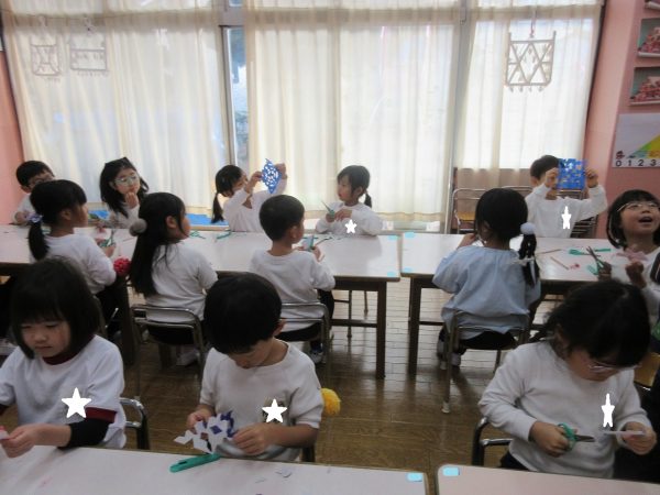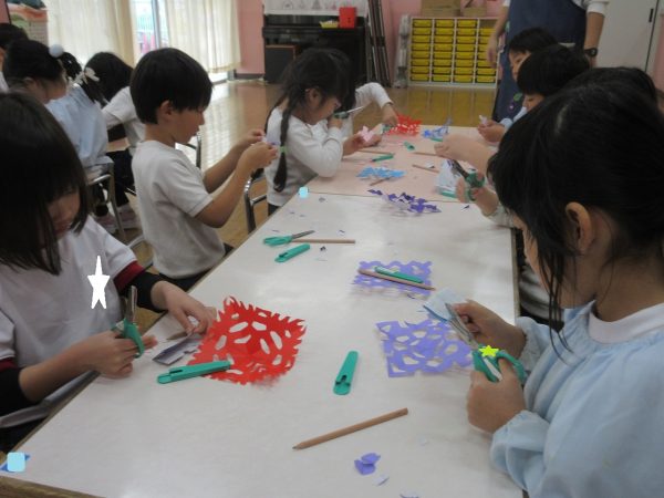 藤組さんが折り紙で紋切の型を鉛筆で書いて、ハサミで切りました。複雑な模様に折り紙を広げる指も慎重に広げます。開いてみるとわぁ~( ^ω^)・・・わぁ~あちらこちらで見せ合いをする姿が見られました。 三角だけでなく、四角でもできるよ。今度は紋切り型を書いても書かなくてもいいよ。