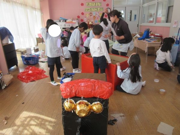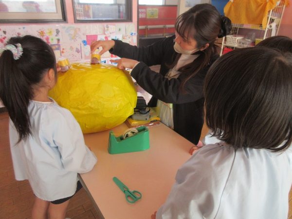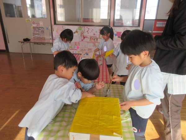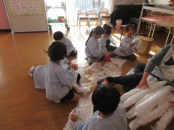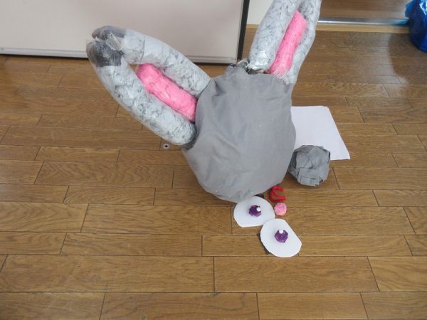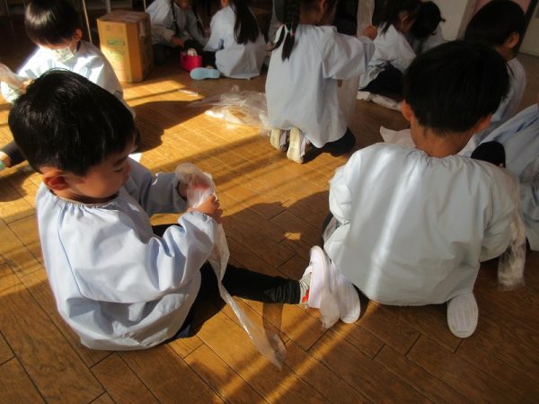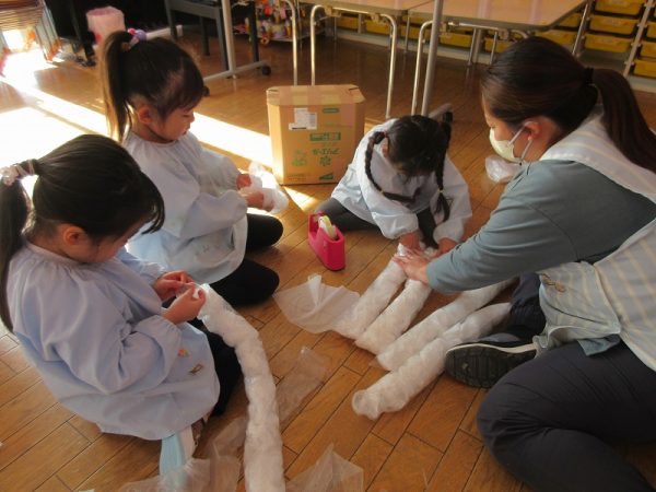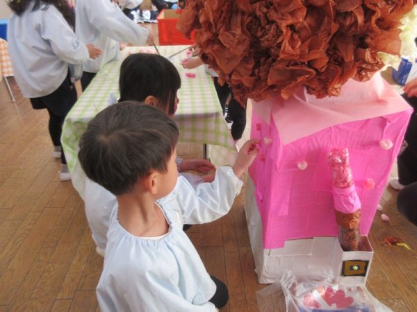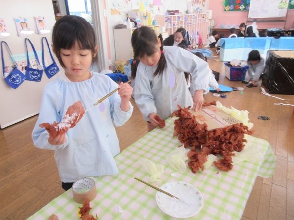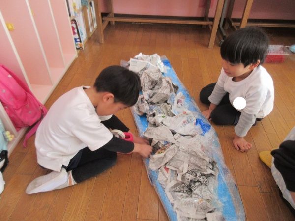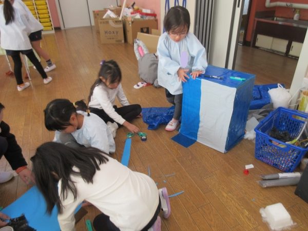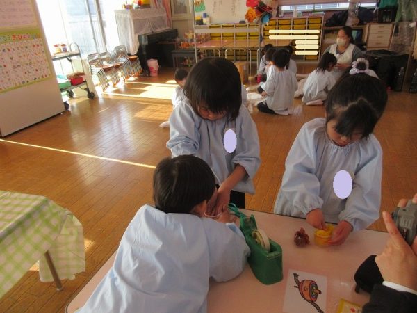 菊組さんのお話は「パン泥棒とスイーツ王子」先にパン泥棒ができあがり、次はスイーツ王子です。スイーツ王子の顔の周りやお洋服をどんな風につくるのかな…。 藤組さんはグループに別れて進めています。「きょうは〇〇と△△と◇◇をつくりました。明日は☆☆と◎◎をつくります」を積み重ねて、完成までの道筋がみえてホッと笑顔のグループもでてきました。