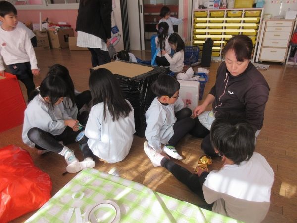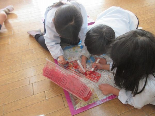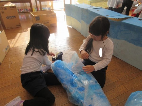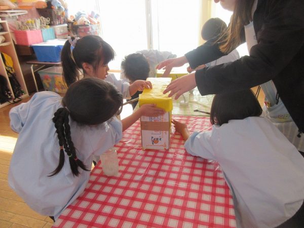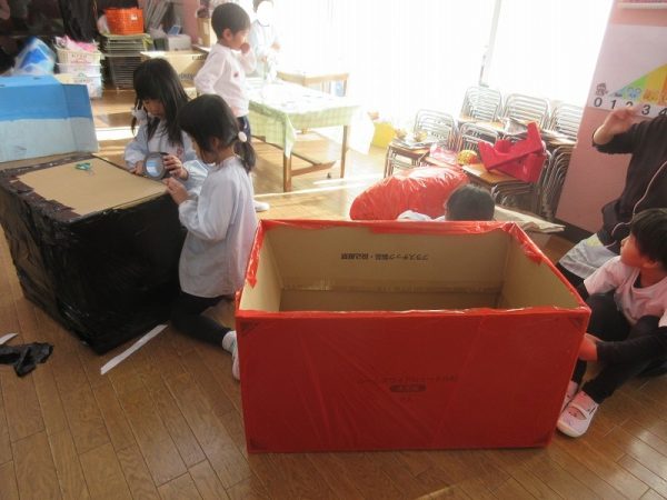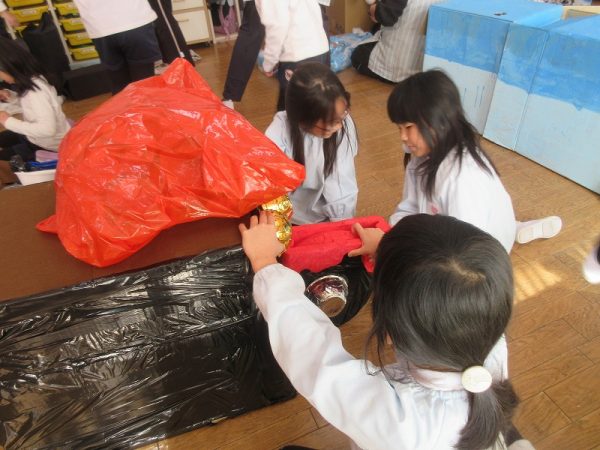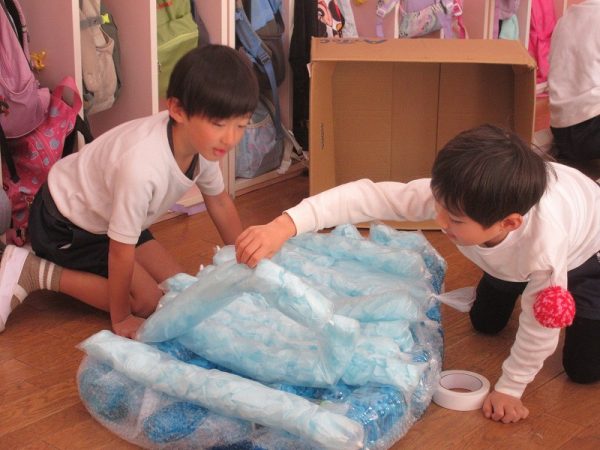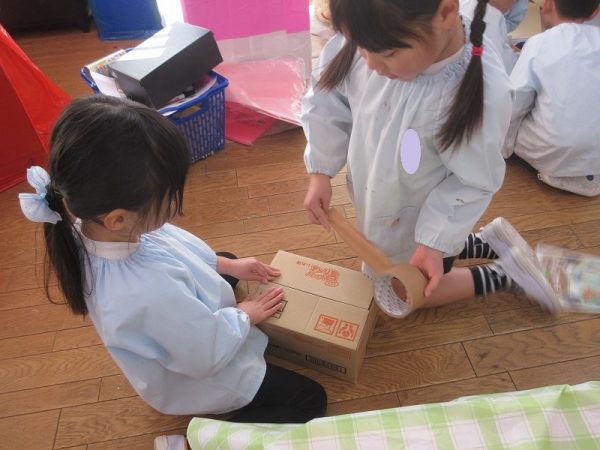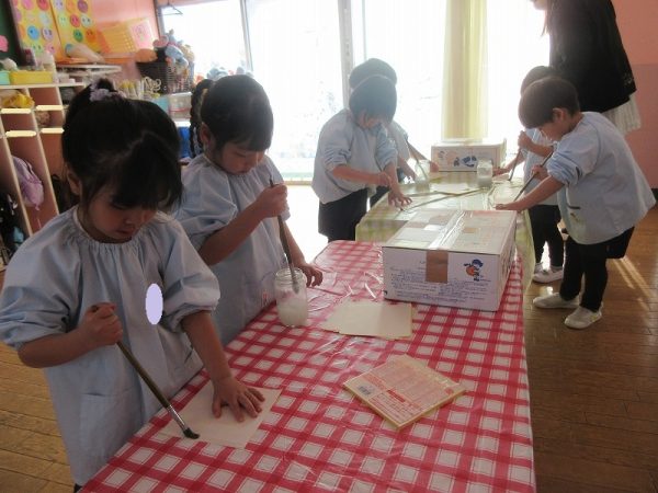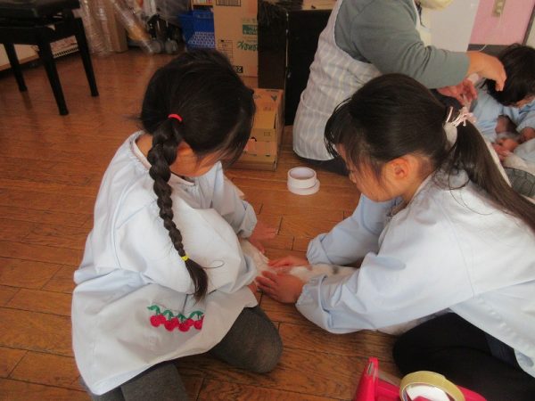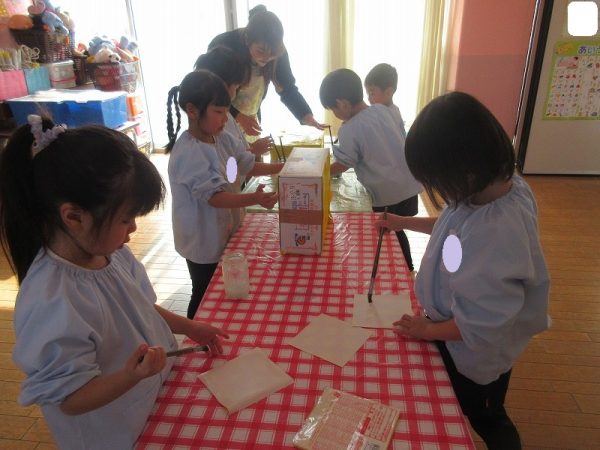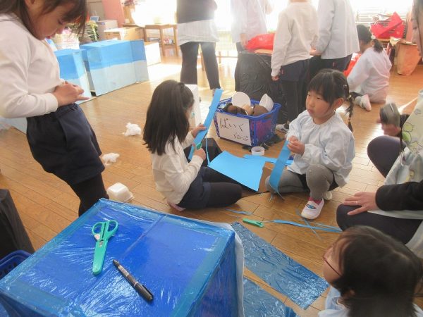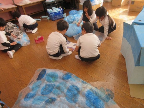 菊組さんのお話は「パン泥棒とスイーツ王子」先にパン泥棒ができあがり、次はスイーツ王子です。スイーツ王子の顔の周りやお洋服をどんな風につくるのかな…。 藤組さんはグループに別れて進めています。「きょうは〇〇と△△と◇◇をつくりました。明日は☆☆と◎◎をつくります」を積み重ねて、完成までの道筋がみえてホッと笑顔のグループもでてきました。