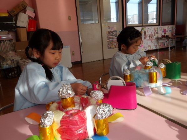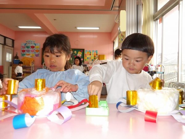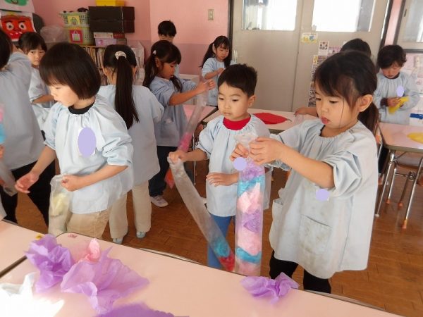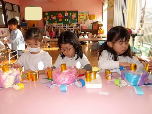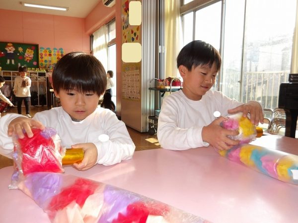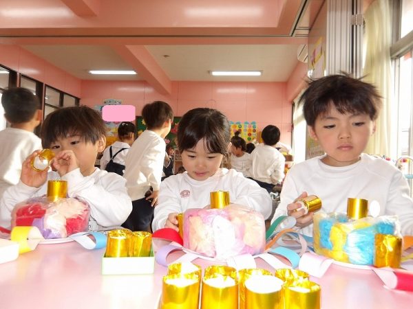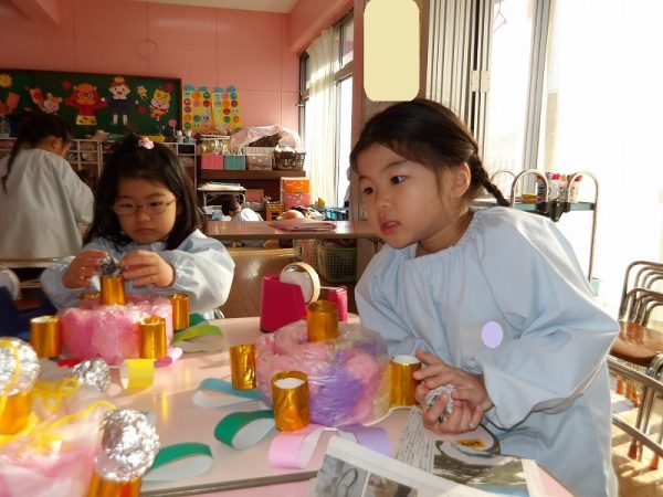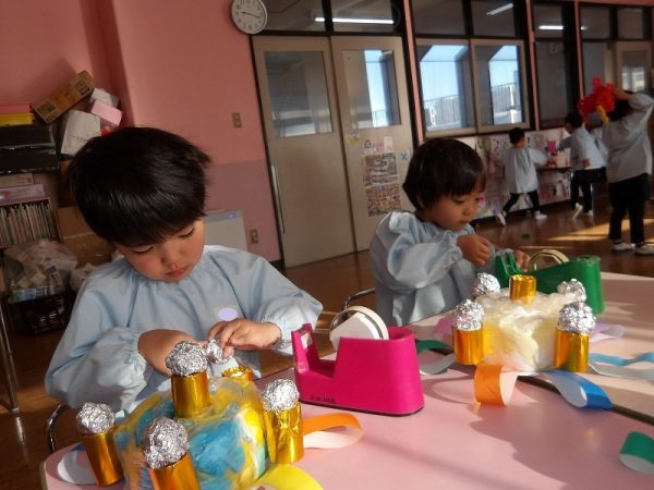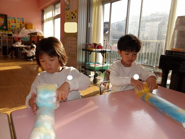 菊組さんが好きな絵本のページにはパン泥棒がスイーツシャンデリアにぶらさがっています。その場面をお部屋に飾りたいそうです。みんなが楽しそうに一人ひとりがつくっていました。 作品展に飾った時は楽しい・キレイがお部屋いっぱいに広がりそうです( ^ω^)・・・